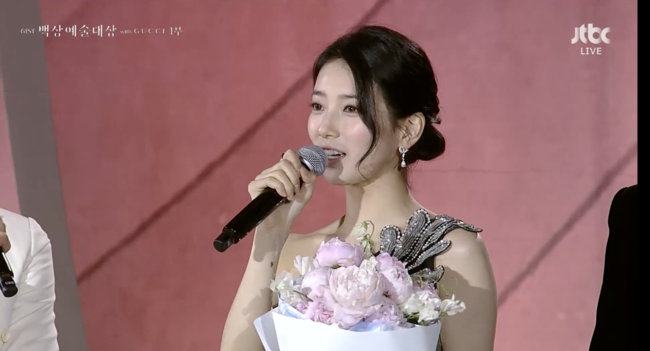 '백상 10년' 수지, 박보검 꽃다발 선물 받았다..역대급 드레스 자태 [61th 백상예술대상]