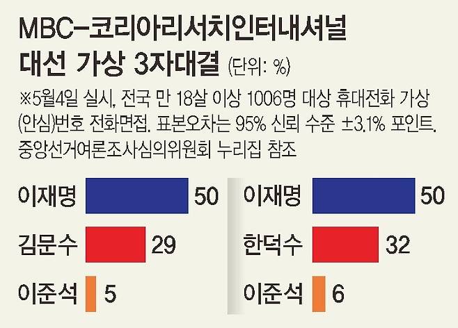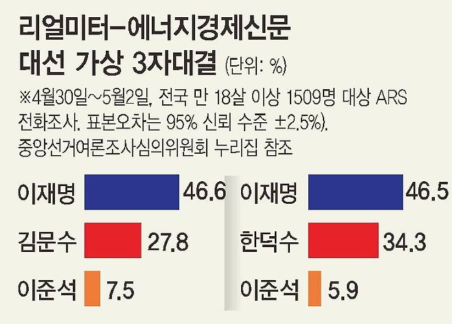 리얼미터 조사에서 한 후보는 이재명 후보(46.5%), 이준석 개혁신당 후보(5.9%)와의 3자 가상대결에서 이 후보와 12.2%포인트 격차를 보였고, 김 후보는 이재명(46.6%)·이준석(7.5%) 후보와의 3자 가상대결에서 27.8%를 얻었다. 코리아리서치인터내셔널 조사에선 이재명·한덕수·이준석 후보가 각각 50%, 32%, 6%였고, 이재명·김문수·이준석 대결 구도에선 각각 50%, 29%, 5%였다. 이 후보가 두자릿수 이상 큰 폭으로 두 사람 모두를 앞서고 있는 가운데, 한 후보와 김 후보가 엇비슷한 격차로 이재명 후보를 따라가는 구도다.