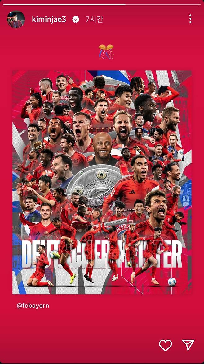 뮌헨의 분데스리가 우승이 확정되자 김민재는 자신의 사회관계망서비스(SNS)를 통해 뮌헨이 2024-25시즌 분데스리가 챔피언으로 등극했다는 사실을 팬들에게 알렸다.