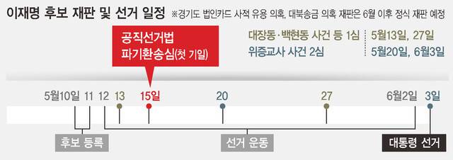 더불어민주당이 조희대 대법원장에게 15일로 통보된 이재명 대통령 후보의 공직선거법 위반 사건 파기환송심 첫 공판기일을 대선 이후로 연기할 것을 요구하면서 조치 시한을 대통령 선거운동이 시작되는 오는 12일로 못박았다. 그날까지 법원의 공식 답변이 없으면 그에 상응하는 조처를 취하겠다는 뜻이다.