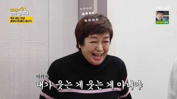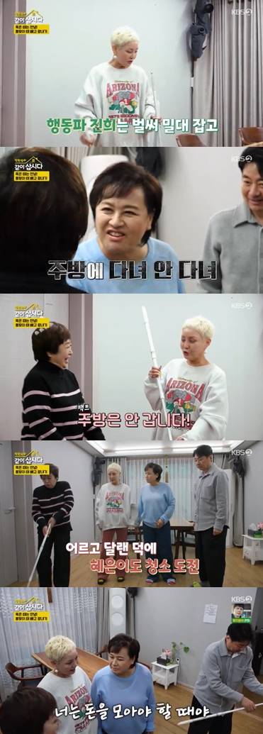 이어 홍진희는 "주방은 내가 하고 언니는 밀대로 밀고 다니면 돼. 스냅을 이용해서 하면 돼"라며 혜은이에게 밀대 사용법을 알려주었다. 이에 윤다훈이 홍진희에게 "누나가 하면 되겠네. 무릎도 좋겠다"라고 말해 홍진희를 발끈하게 만들었다.