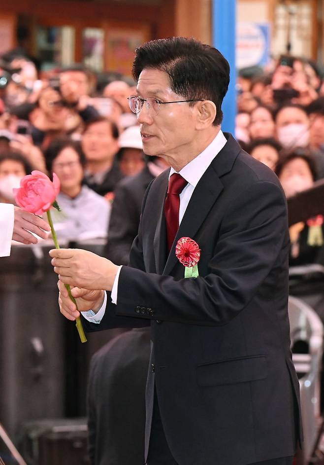 | ▲ 김문수 대선 후보, 부처님오신날 봉축법요식 헌화 국민의힘 김문수 대선 후보가 5일 서울 종로구 조계사에서 열린 불기 2569년 부처님오신날 봉축법요식에서 육법공양 중 헌화를 위해 이동하고 있다. |