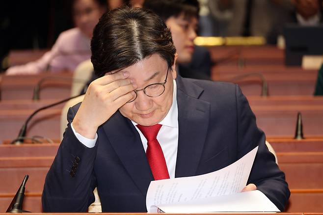 | ▲ 자료보며 생각에 잠긴 권성동 원내대표 국민의힘 권성동 원내대표가 5일 서울 여의도 국회에서 열린 의원총회에 참석해 자료를 살펴보고 있다. |