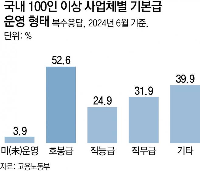 고용부 통계에 따르면 지난해 6월 기준 국내 전체 사업체 중 호봉급 도입 비중은 12.8%다. 반면 100인 이상 사업체에서는 이 비중이 52.6%로 크게 높아진다.