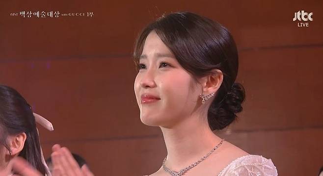 이날 8개 부문 후보에 오르며 '제61회 백상예술대상'에 최다 노미네이트 된 '폭싹 속았수다'는 극본상, 작품상, 여자 조연상, 남자 조연상으로 4관왕을 차지했다. 최우수 연기상 후보에 올랐던 아이유와 박보검은 수상하지 못했지만, 수상대에 오른 김원석 감독과 염혜란, 최대훈의 수상소감에 눈물을 글썽거리며 축하했다.
