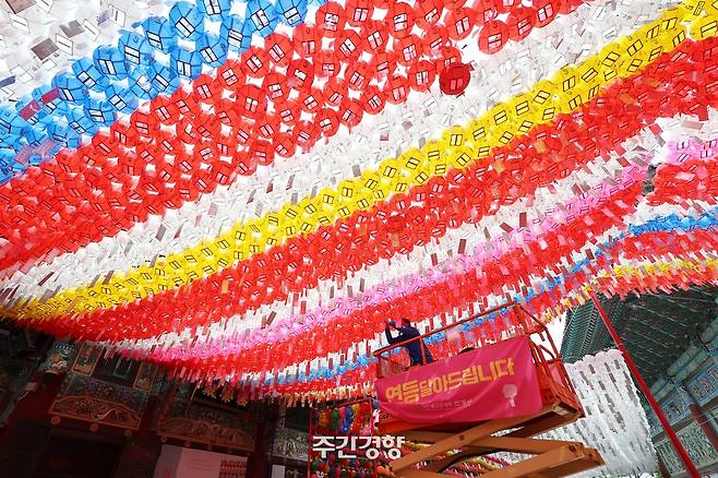 불기 2569년 부처님 오신 날을 일주일 앞둔 서울 종로구 조계사 대웅전 앞마당이 형형색색의 연등으로 물들었다. 불자뿐만 아니라 가족 나들이객과 외국인 관광객은 지나가던 발걸음을 멈추고 연등을 구경하며 사진을 찍었다. 연등은 우리의 마음을 밝고 맑고 바르게 하여 불덕(弗德)을 기리고, 등불로 어두운 세상을 밝힌다. 돌아가신 분들의 명복과 소중한 사람을 위한 소망을 담은 소원지를 함께 매달기도 한다.