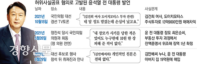 검찰은 또 윤 전 대통령이 기자들과 만나 화천대유자산관리 대주주 김만배씨와 “친분이 전혀 없다”고 말한 점, 정진석 당시 국민의힘 의원에게 “(장모 최은순씨가) 누구한테 10원 한 장 피해준 적 없다”고 말했다가 정 의원을 통해 이 발언이 언론에 공개된 점도 허위사실공표에 해당하는지 살펴보고 있다.