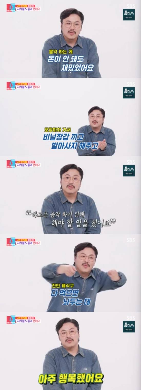이어 "편의점 폐기 삼각김밥를 얻어 먹고, 잔반 폐식구에서 남은 음식도 먹으면서 지냈다. 놀이터에서 자기도 하고. 저뿐만 아니라 그때 함께 음악하던 친구들이 다 그랬다. 그런데 아주 행복했다"고 당시를 떠올렸다.