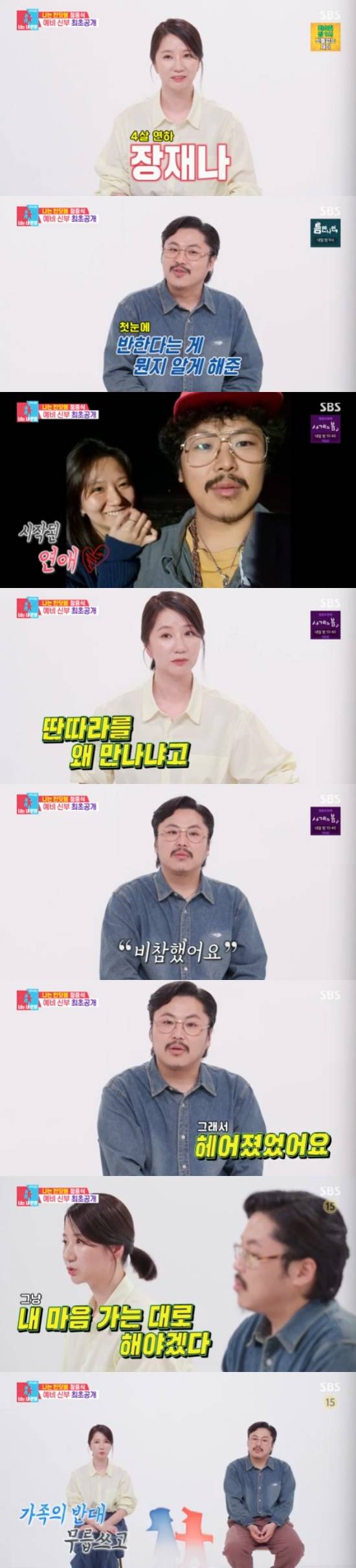 하지만 이별 일주일 후 장재니가 먼저 정중식을 붙잡았다. 장재니는 "제 선택을 믿고 부모님의 반대에도 다시 만나기로 했다"면서 "(장중식이) 이때까지 안해 본 일이 없더라. 무슨 일을 해서라도 저를 굶기지는 않을 것 같았다"고 믿음을 드러내 눈길을 끌었다.
