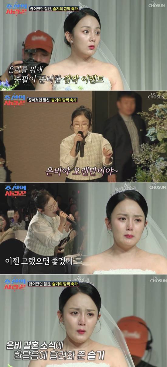 박슬기는 깜짝 축가를 부르며 결혼식장에 들어섰고, 강은비는 깜짝 놀라 어쩔 줄 몰라하더니 눈물을 터뜨렸다.