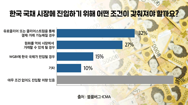 지난해 7월 발간된 블룸버그-국제자본시장협회(ICMA)가 보고서를 냅니다. 해외 투자자 3백여 명에게 한국 국채 투자를 위해 필요한 환경을 물었습니다. 응답자의 48%는 아무 조건 없이도 진입하겠다 했지만, 그 다음으로 많은 32%가 유로클리어 등 국제예탁결제기구를 통한 국고채 거래가 가능해야 한다고 답했습니다.