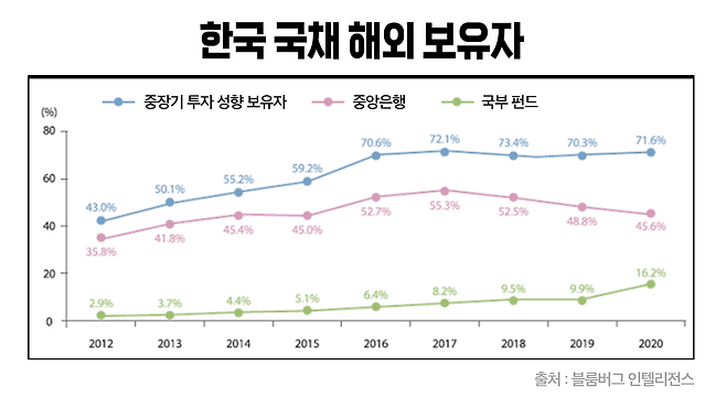 "해외의 중앙은행 등이 한국 국채를 '사랑'한다"고도 표현했는데, 한국 국채 보유자의 절반 정도가 각국 중앙은행과 국부펀드이었다고 합니다. 한국 국채를 보유한 국가 수도 2006년 19개국에서 2020년 47개국으로 늘었다고 전했습니다.