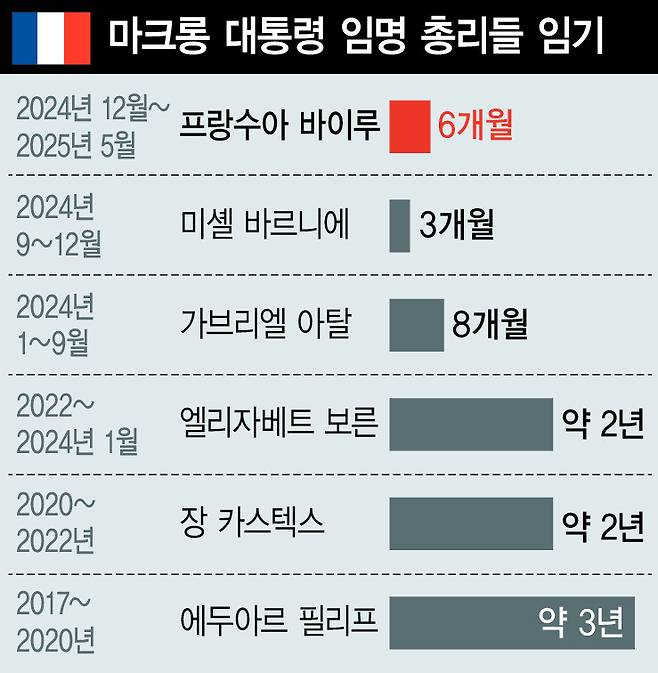 2017년 대선에서 승리한 뒤 마크롱 대통령이 지금껏 임명한 프랑스 총리는 6명이다. 에두아르 필리프(2017~2020년), 장 카스텍스(2020~2022년), 엘리자베트 보른(2022년~2024년 1월)까지는 2~3년의 임기를 유지했다. 하지만 가브리엘 아탈(2024년 1~9월), 미셸 바르니에(2024년 9~12월)는 몇개월을 넘기지 못하고 있다. 바르니에는 마크롱 대통령이 지난해 여름 총선에서 국민연합 정부 구성을 막는 데 가장 큰 공을 세운 좌파연합(신인민전선) 대신 우파에서 총리를 지명한 뒤, 신인민전선이 마크롱 정부에 등을 돌리면서 62년 만에 의회에서 불신임당했다. 지난해 12월13일 임기를 시작한 프랑수아 바이루 현 총리조차 임기 6개월 만에 또다시 불신임안 논의가 불거지고 있다.