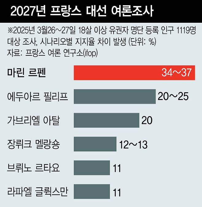 2027년 대선은 프랑스 현대사에서 중요한 전환점이 될 것으로 전망된다. 르펜은 대선 출마 금지 판결을 받기 직전인 3월26~27일 실시된 ‘프랑스 여론 연구소’(ifop)의 여론조사에서 상대 후보가 누구냐에 따라 시나리오별로 지지율이 34~37%로 다소 차이가 있지만 1위를 기록했다.
