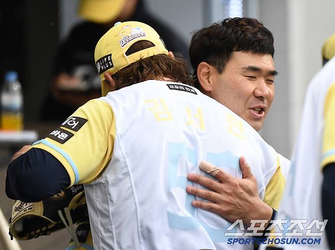 함께 호흡을 맞춘 포수 이재원이 다가와 와이스를 안았다.
