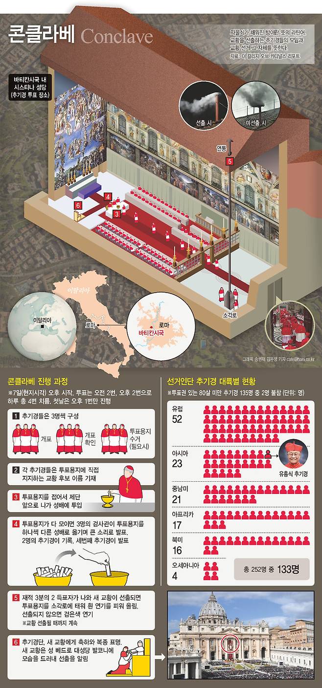 7일 오후 바티칸 시스티나 성당에서 시작되는 콘클라베는 추기경 선거인단의 3분의 2 이상인 최소 89명의 지지를 얻은 추기경이 교황으로 선출될 때까지 계속된다. 첫날엔 오후 4시30분 한번만 투표를 하고, 이후엔 매일 오전과 오후에 두번씩, 최대 네번 투표를 진행한다. 투표 결과는 시스티나 성당 위에 설치된 굴뚝의 연기 색깔을 통해 알 수 있다. 교황이 선출되면 흰 연기가 피어오르지만 그렇지 않을 경우 검은 연기가 올라온다. 이 과정을 반복해 다수표를 얻은 교황이 교황직 수락 동의를 하면 콘클라베는 종료된다. 교황 선출 과정의 모든 내용을 비밀로 지킨다는 비밀 엄수 서약을 한 추기경들은 외부와 완전히 차단된 채 투표를 진행한다. 교황청은 콘클라베 첫 투표를 진행하기 1시간 반 전부터 바티칸시국 안에 설치된 휴대전화 통신 신호 전송 시스템을 비활성화하기로 하는 등 보안 유지에 총력을 기울이고 있다.