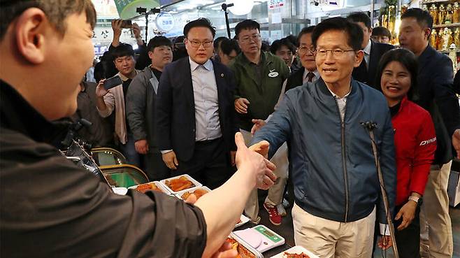 ▲ 국민의힘 김문수 대선 후보가 4일 경기도 의정부제일시장을 방문해 상인과 인사하고 있다.