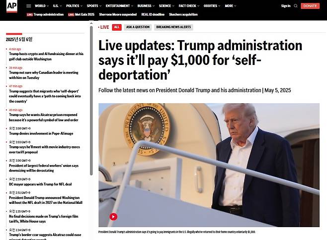 | ▲ 도널드 트럼프 미국 행정부의 '셀프 추방' 불법 이민자 지원 방침을 보도하는 AP통신 |