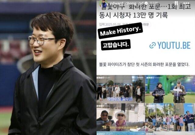 장 PD는 6일 자신의 SNS 스토리에 “Make History. 고맙습니다”라는 짧은 문구를 남기며 첫 방송에 대한 소회를 밝혔다. 이는 지난 5일 오후 유튜브 채널 StudioC1을 통해 공개된 ‘불꽃야구’ 1화가 시청자들의 뜨거운 반응을 얻은 직후다.