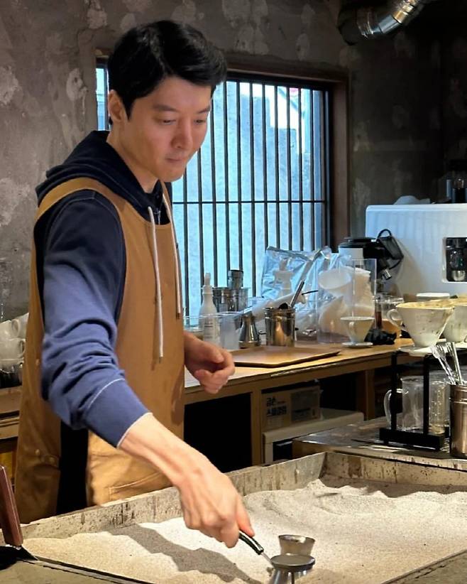 사진 속에는 제주도에서 자신이 운영 중인 카페에서 일을 하고 있는 이동건의 모습이 담겨있다.