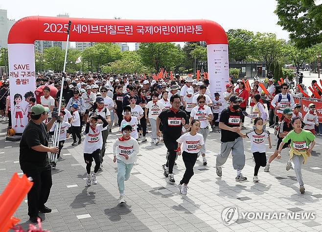 (서울=연합뉴스) 김성민 기자 = 6일 서울 마포구 월드컵공원에서 국제아동권리 비정부기구(NGO) 세이브더칠드런과 국가기간뉴스통신사 연합뉴스가 공동 주최한 '2025 국제어린이마라톤대회'에서 참가자들이 출발하고 있다. 2025.5.6