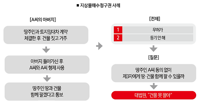 "특별한 사정이 없는 한 행정관청의 허가를 받은 적법한 건물이 아니더라도 임차인의 지상물매수청구권의 대상이 될 수 있다. 그리고 건물을 매수해 점유하고 있는 사람은 등기 명의가 없다고 하더라도 권리의 범위 내에선 점유 중인 건물의 법률상 또는 사실상의 처분권을 가지고 있다." A씨와 그의 형제들에게 지상물매수청구권이 있음을 명시적으로 확인한 셈이다.