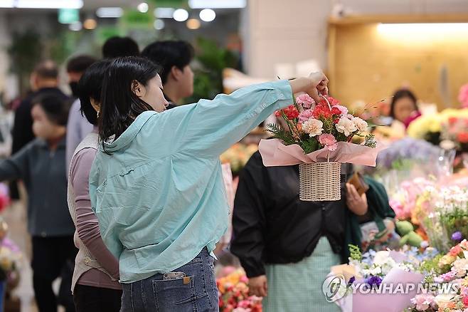 (서울=연합뉴스) 임화영 기자 = 어버이날을 앞둔 6일 서울 서초구 양재꽃시장을 찾은 시민이 카네이션을 살펴보고 있다. 2025.5.6