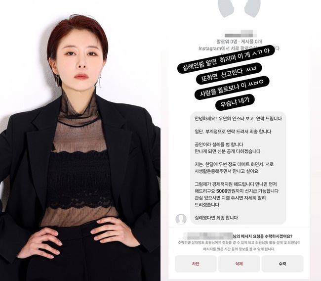 이어 ‘그럼 제가 경제적 지원 해드립니다. 만나면 먼저 해드리구요. 5000만 원까지 선지급 가능합니다. 관심 있으시면 DM 주시면 자세히 알려드리겠습니다. 실례였다면 죄송합니다’라는 내용이 적혀있다.