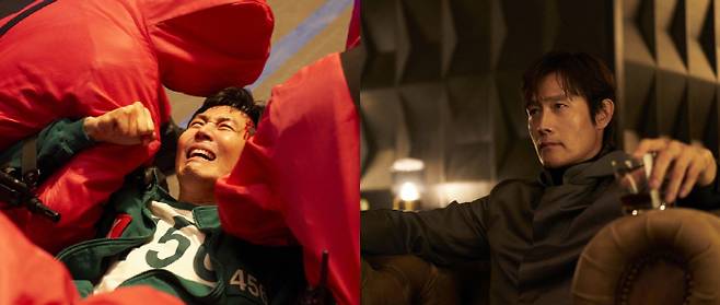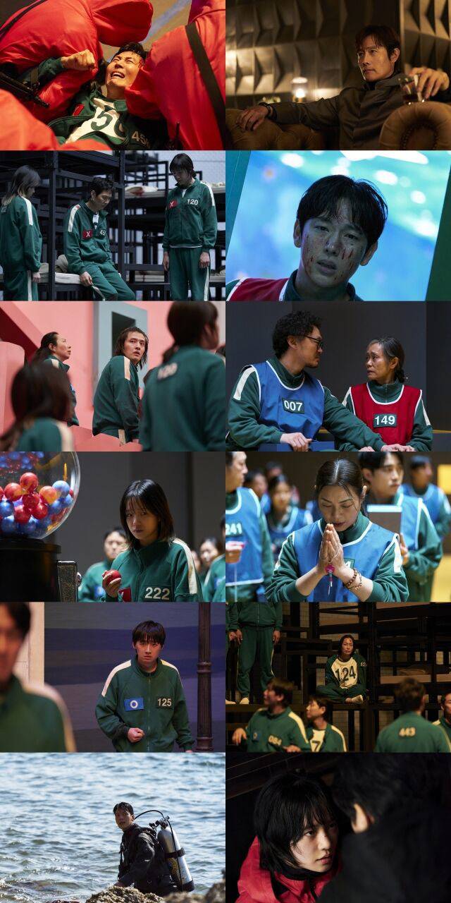 핑크가드들에게 붙잡혀 울부짖고 있는 기훈의 스틸은 그의 처절한 심정을 고스란히 전달한다. 기훈의 스틸과 달리 여유가 느껴지는 프론트맨의 스틸은 참가자 1번 영일에서 게임의 총괄자로 돌아온 프론트맨이 기훈과 어떤 대결을 이어가게 될지 눈길을 끈다.