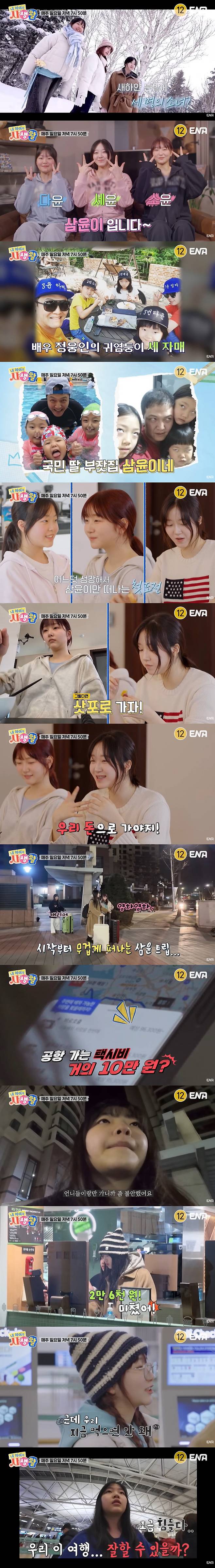 세 자매는 태어나서 처음으로 떠나는 셋 만의 여행지를 삿포로로 정했다. "얼마가 필요하냐"는 정웅인의 질문에 "우리 돈으로 가야지"라며 자신만만하게 나선 삼윤 자매. 그러나 출국 당일 캐리어 네 개를 끌고 공항에 가는 길부터 문제였다. 짐을 모두 싣기 위해서는 택시 두 대를 불러야 했는데, 약 20만원의 경비가 소요된 것. 또한 공항에서는 예산을 아끼기 위해 굶고, 긴 줄을 기다리는 등 우여곡절을 겪었다.