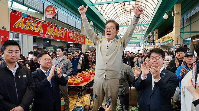 ▲ 더불어민주당 이재명 대선 후보가 '골목골목 경청투어' : 국토종주편'에 나선 6일 충북 증평군 증평장뜰시장을 찾아 즉흥 연설을 하고 있다.