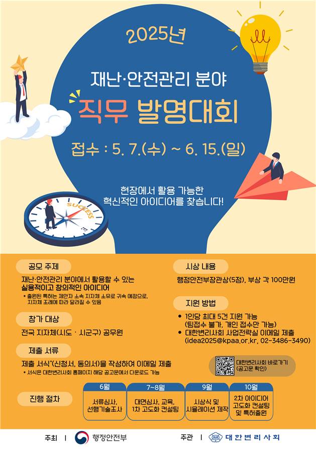 [헤럴드경제=이태형 기자]행정안전부는 지자체 공무원을 대상으로 이달 7일부터 6월 15일까지 ‘2025년 재난·안전관리 분야 직무 발명대회’를 개최한다.