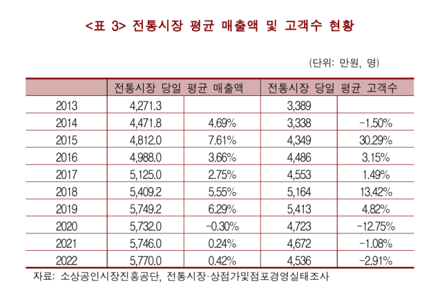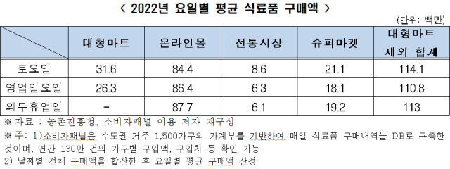한국경제연구원이 2022년 농촌진흥청 자료에 근거해 연 130만 건의 소비자 구매 데이터를 분석한 결과 일평균 전통시장 식료품 구매액은 대형마트 의무휴업일 기준 610만원으로 오히려 대형마트가 영업하는 일요일(630만원)보다 낮았다.