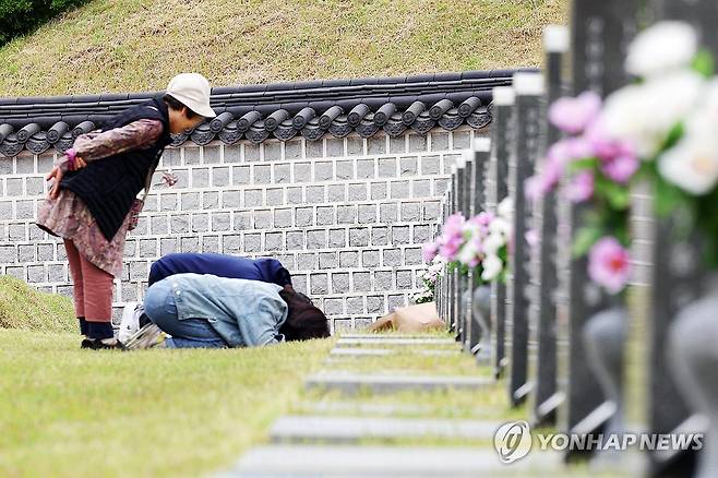 (광주=연합뉴스) 정다움 기자 = 어린이날 연휴 마지막 날인 6일 낮 광주 북구 국립 5·18 민주묘지에서 시민들이 참배하고 있다. 2025.5.6