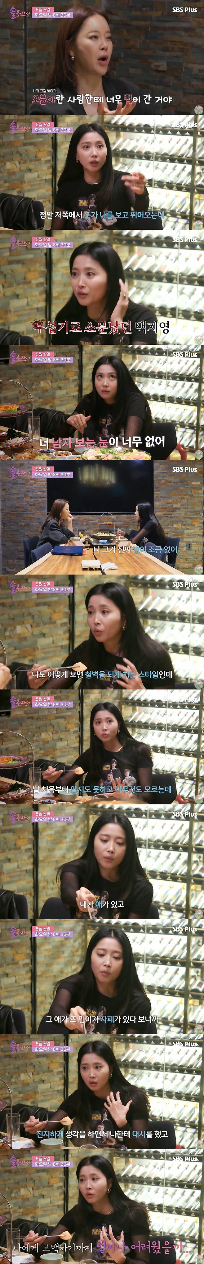 이에 백지영은 "너는 바로 연애지 않냐. 이제는 연애를 너무 빨리 시작하지 말고 좀 만나보는 게 어떠냐. 좀 시간을 두고 보다가"라고 했지만, 오윤아는 "썸을 타본 적이 별로 없다. 나이도 있는데 썸을 길게 하는 것도 이상하지 않냐"며 웃었다.