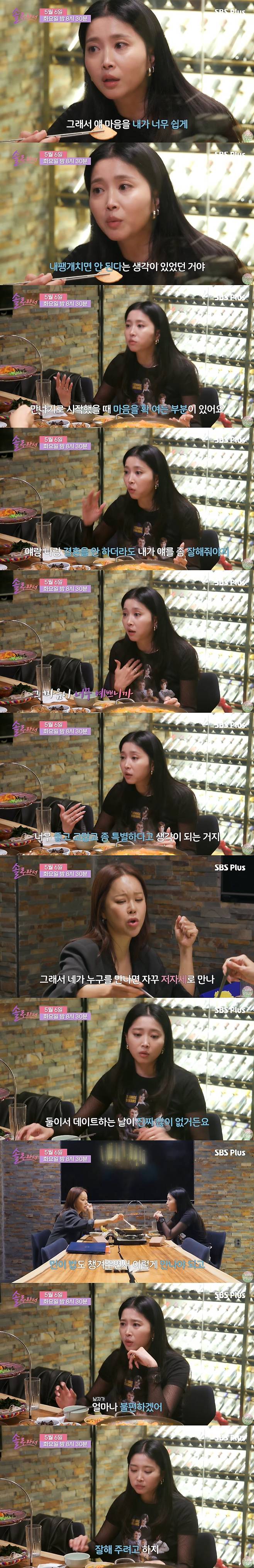 이를 들은 백지영은 "네가 누구를 만나면 자꾸 저자세로 만난다"고 했다. 이에 오윤아는 "둘이서 데이트하는 날이 진짜 많이 없다"면서 "민이랑 같이 셋이 집에 있으면서 민이 밥도 챙겨주면서 만나야 되고 남자가 얼마나 불편하겠냐"며 이유에 대해 털어놨다.