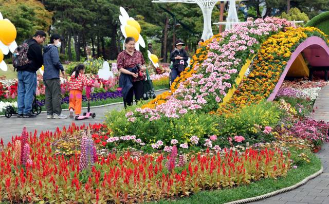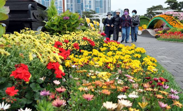 6일 휴일을 맞아 부산 부산진구 부산시민공원을 찾은 나들이객들이 다솜광장 일원에서 열리고 있는 ‘제5회 부산 봄꽃 전시회’를 둘러보고 있다.