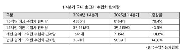 초고가 수입차를 제외하면 수입차 시장의 판매고는 오히려 둔화하는 추세다. 1·4분기 1억5000만원 미만 수입차 판매량은 3만5159대로 전년동기(3만5318대)와 비교해 0.5% 줄어들었다.