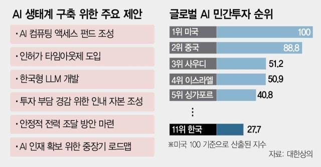 대한상의는 한국의 반도체·에너지 등 역량을 고려할 때 AI 잠재력은 크지만 투자 규모가 작아 AI 글로벌 패권 경쟁에서 밀릴 가능성이 있다고 우려했다. 영국 데이터 분석 업체에 따르면 한국의 AI 민간투자는 전 세계 11위로 1위 미국의 4분의 1, 2위 중국의 3분의 1 수준에 불과하다. 대한상의는 “과거 국제통화기금(IMF) 사태 당시 3~4년간 정보기술(IT)에 국가 자원을 투입해 강국으로 올라설 수 있었다”며 “AI도 마찬가지로 향후 3~4년이 G3 국가로 도약할 골든타임”이라고 강조했다.