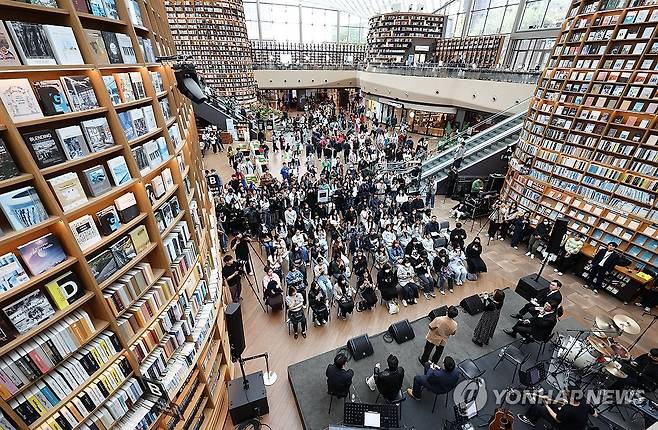 (서울=연합뉴스) 김인철 기자 = 6일 서울 강남구 스타필드 코엑스몰 별마당도서관에서 열린 서울시뮤지컬단 신작 '더 퍼스트 그레잇 쇼' 프리뷰쇼에서 서유진, 김범준 배우가 '갑자기 음악이 흐르는 순간'이라는 곡을 부르고 있다. 2025.5.6