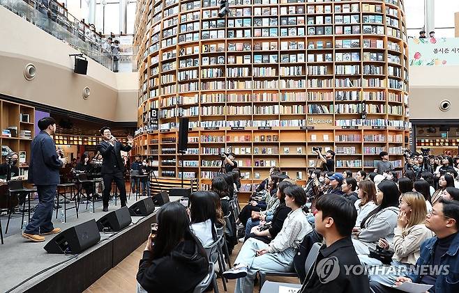 (서울=연합뉴스) 김인철 기자 = 6일 서울 강남구 스타필드 코엑스몰 별마당도서관에서 열린 서울시뮤지컬단 신작 '더 퍼스트 그레잇 쇼' 프리뷰쇼에서 박성훈, 이승재 배우가 '예술적으로'라는 곡을 부르고 있다. 2025.5.6