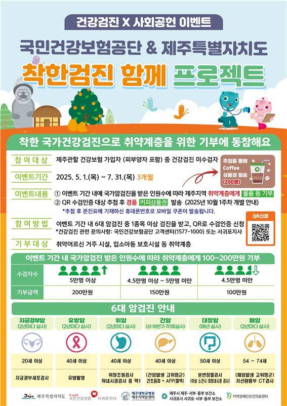 피부양자를 포함한 제주 건강보험 가입자 중 아직 건강검진을 받지 않은 사람이 올해 5월~7월 3개월 안에 국가암검진을 받으면 취약계층에게 물품을 기부하는 방식이다.