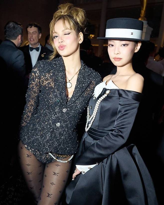제니는 블랙 팬츠 수트에 오프숄더 톱, 진주 체인과 꽃 장식이 더해진 중절모로 절제된 고전미를 자아냈다. 멧 갈라 무대는 올해로 세 번째로, 익숙한 듯 여유로운 포즈가 인상적이었다.
