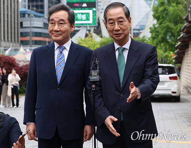 | ▲ 이낙연 전 총리와 한덕수 무소속 대선 예비후보가 6일 오후 서울 중구 컨퍼런스하우스 달개비앞에서 오찬회동 결과를 브리핑하고 있다. |