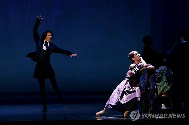 (서울=연합뉴스) 임화영 기자 = 6일 서울 서초구 예술의전당 오페라극장에서 열린 국립발레단 제204회 정기공연 '카멜리아 레이디' 프레스콜에서 마르그리트 코티에 역의 조연재와 아르망 뒤발 역의 변성완이 시연하고 있다. 2025.5.6