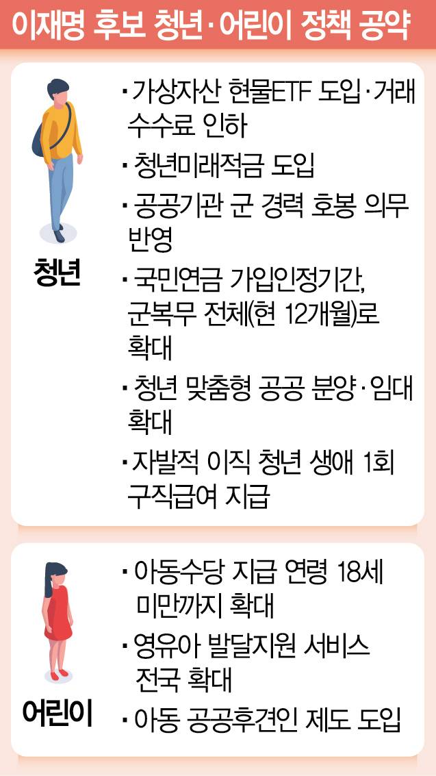 이 후보는 “가상자산 현물 상장지수펀드(ETF)를 도입하고, 통합 감시 시스템을 구축해 안전한 가상자산 투자 환경을 조성하겠다”며 “거래 수수료 인하도 유도하겠다”고 밝혔다. 궁극적으로 가상자산 시장을 제도권 안으로 끌어들이겠다는 구상을 밝힌 셈이다. 또 “청년의 일할 권리를 강화하고, 더 많은 기회를 만들겠다”며 △구직 활동 지원금 확대 △자발적 이직 청년에 생애 1회 구직급여 지급 추진 △채용 연계형 직업 교육 프로그램 확산 지원 등을 공약으로 제시했다. 청년층의 자산 형성 지원을 위해 ‘청년내일채움공제’를 보완·개선한 청년미래적금을 도입하겠다는 방침도 밝혔다.