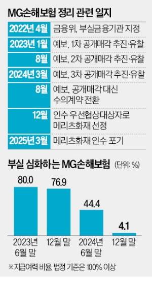 문제는 MG손보 부실이 갈수록 심해지고 있어 문제를 방치할 수 없다는 점이다. MG손보의 지급여력(K-ICS·킥스) 비율은 2023년 말 76.9%에서 작년 말 4.1%로 주저앉았다. 킥스 비율은 보험사 건전성을 나타내는 지표로 법상 기준선은 100%다. 이런 상황에도 MG손보는 제대로 된 구조조정을 하지 않았다. MG손보가 작년 한 해 종업원 급여로 지출한 금액만 560억원에 달한다. 부실이 커질수록 예보가 MG손보 정리를 위해 투입해야 하는 기금은 늘어날 수밖에 없다.