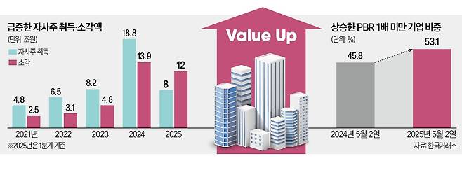 정부가 ‘기업가치 제고 계획’(밸류업) 가이드라인을 발표한 지 1년 만에 상장사의 자사주 취득과 소각 금액이 역대 최대치를 기록했다. 그러나 주가순자산비율(PBR) 1배 미만인 기업 비중은 1년 새 오히려 커지는 등 고질적인 코리아 디스카운트 문제를 해소하기엔 역부족이라는 지적이 나온다.