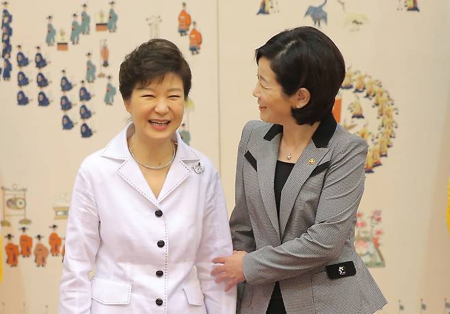 | ▲ 2014년 7월 18일, 박근혜 당시 대통령이 청와대에서 김희정 여성가족부 장관에게 임명장을 수여한 뒤 기념촬영을 하고 있다. |