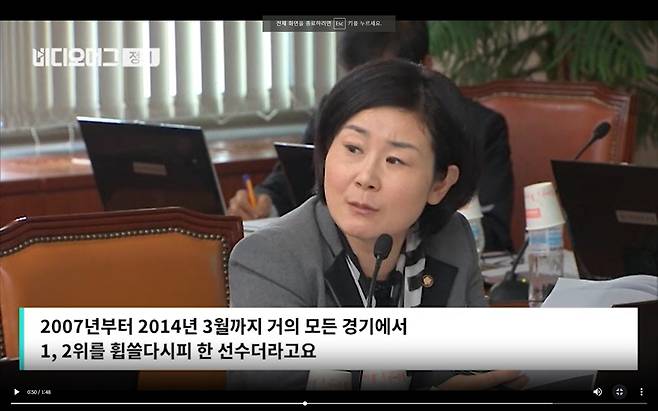 | ▲ 2014년 4월 11일 교문위 전체회의에서 김희정 의원은 "(정유라는) 2007년부터 2014년까지 모든 경기에서 1~2위를 휩쓸다시피한 선수다, 아주 오랫동안 훌륭하게 커왔다"라고 말했다. 3개월 뒤, 김 의원은 여성가족부 장관에 임명됐다. |